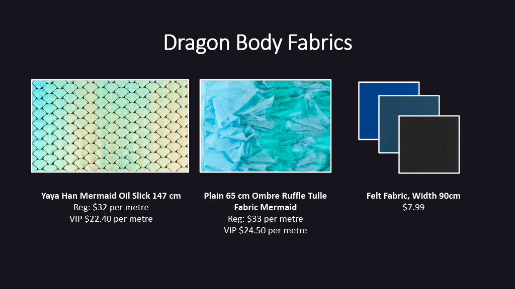 We decided the theme of our dragon is water and ocean elements. I searched up materials in Lincraft and Spotlight, as suggested by Estelle, and managed to narrow down our material choices.
